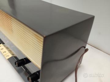 Marca PHILIPS modello B2 10A costruita a Milano dal 1960 al 1962, al suo interno lo sciassi è totalmente originale, revisionato e reso funzionante, monta 6 valvole UCC85 UF89 UCH81 UABC80 UL84 UY 85 Riceve le gamme FM OM , TV non più attiva. Il tasto OM non rimane inserito, 310x170x165 pesa 3,3 Kg il mobile è in bachelite e plastica. Schema elettrico a corredo, altri dati su radiomuseum