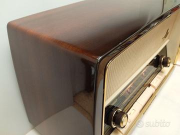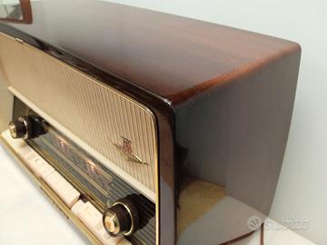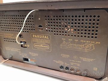 Marca NORDMENDE modello PARSIFAL STEREO Z170 prodotto in Germania dal 1961 al 1963 monta 8 valvole ECC85 ECH81 EF89 EBC81 EABC80 EL84 EL84 EM84 , 4 gamme d’onda FM OM OC e OL, chassis completamente originale, revisionato, funziona perfettamente, con i suoi 2 altoparlanti ellittici di notevoli dimensioni ha una resa sonora eccezionale, tipica dell’epoca per una radio di alta gamma. È una radio solida, senza troppi fronzoli; la differenza rispetto ai modelli degli anni '50 è evidente: linee dritte, meno ottone e primi utilizzi della plastica. La finitura con una lacca in resina sintetica, ancora oggi brillante. Dimensioni (LxAxP) 575X340X mm peso 11,7 Kg. Altri dati su radiomuseum.