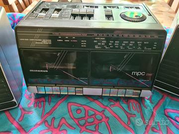 L'oggetto nell'immagine è una radiocassetta Minerva, modello MPC 2365. Questo modello, prodotto dalla marca Minerva, è un apparecchio audio portatile che combina una radio AM/FM con un lettore di audiocassette. L'esemplare mostrato ha una scocca nera e include un altoparlante separabile.tutto nuovo funziona a pile e corrente