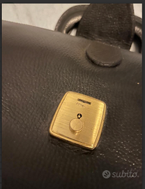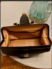 in cuoio/pelle nera di altissima qualità. struttura in metallo e chiusura con chiave, completamente foderata all'interno. Dotata di tasca interna, una base rinforzata e piedini per proteggere il fondo della borsa. CONDIZIONI: vintage ottimo stato conservativo, pari al nuovo.