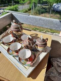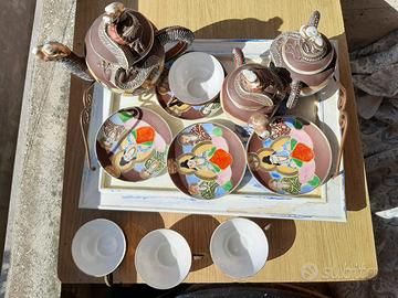 Vendo splendido e raro set da tè in porcellana, caratterizzato da un design orientale unico e affascinante. Questo servizio, ispirato allo stile Satsuma, presenta decorazioni dipinte a mano di draghi e figure tipiche.