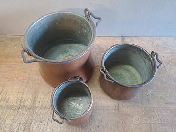 3 pentole antiche in perfette condizioni grande H18 diametro 18.5 medio H14 diametro 13.5 piccolo H10.5 diametro 10