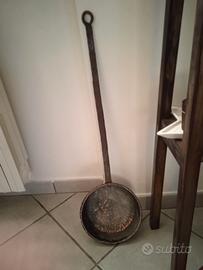 Pentola in rame con manico in ferro, vintage. Da lucidare. Lunghezza totale cm 78, diametro pentola cm 23, spessore cm 6,5.