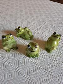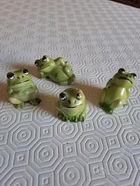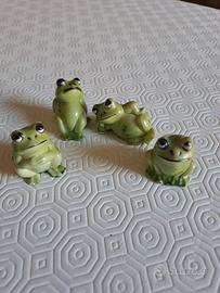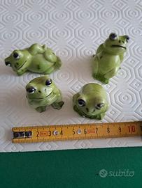 Set composto da 4 statuette raffiguranti rane in ceramica smaltata verde. Soprammobili decorativi molto carini, ottimi come oggetti da collezione. Ogni rana ha una posa diversa, il che rende il set originale e divertente, perfetto per decorare casa, una mensola o una scrivania. Lo smalto lucido e i dettagli degli occhi danno alle figure un aspetto vivace e curato. Ideali anche come idea regalo o per collezionisti di oggetti a tema animali. In buone condizioni, senza rotture evidenti (normali segni del tempo). Misure: circa 4 cm per lato. Prezzo trattabile (vendibili in blocco unico).