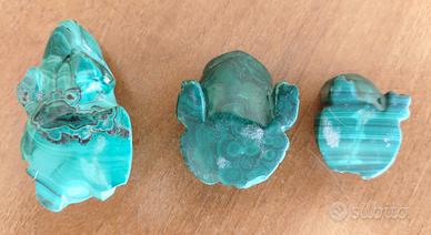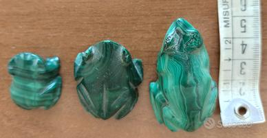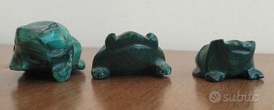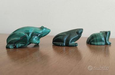 Tre ranocchi in pietra, rappresentanti una famigliola con maschio, femmina e figlio. Credo che siano in giada. Presentano alcune scheggiature, visibili in foto. Trattasi di artigianato africano, molto belli.