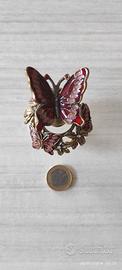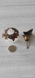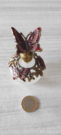 Rarissima, prestigiosa ed estrosa bottiglietta porta profumo in vetro di Murano vintage con artistiche applicazioni in ottone smaltato lavorato rigorosamente a mano. Notevolissimo l'artistico tappo "a farfalla" in ottone smaltato, con qualche strass, anch'esso lavorato a mano.