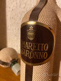 Bottiglia vintage di Amaretto di Saronno, prodotta da Illva Saronno in rarissima bottiglia verde trilobata rivestita in juta.