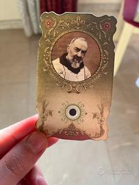 Santino di Padre Pio con reliquia tessile e preghiera per la canonizzazione (anni ’80-’90). Stampa a colori con bordi sagomati, prodotto dal Convento “Padre Pio” – Frati Minori Cappuccini, Pietrelcina. Sul retro preghiera per ottenere la canonizzazione del Beato Padre Pio (avvenuta nel 2002). Presente reliquia tessile applicata. In ottime condizioni, ideale per collezionisti di santini con reliquia pre-canonizzazione.