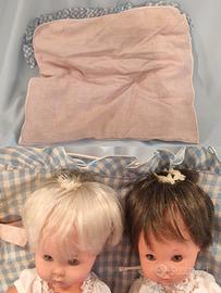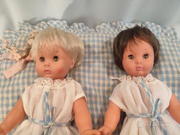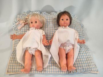 Bellissima e rara coppia di bambole CELESTINO della FURGA, anno 1963, creazione Prof. Fulgido Arpaia; con marchio Furga Italy sulla la testa e sulla schiena; alte cm. 29; il cuscino misura cm. 40x32 circa. Bambole interamente in vinile con capelli radicati, occhi fissi, ciglia in cotone, sopracciglia disegnate a trattino, “voce a fischietto” sulla schiena. Sono venduti nella confezione in coppia, un maschietto e una femminuccia; il maschietto con capelli biondi e la femminuccia capelli mori, entrambi hanno fra i capelli dei fiori myosotis. Indossano un piccolo ciripà e una camicetta da notte in battista bianca profilata di celeste e rosa; le bambole sono appoggiate su un cuscinetto imbottito a quadretti bianco e celeste contornato con volant con fiorellini myosotis rosa cuciti in un angolo con un nastrino; il dietro del cuscino è in tessuto color rosa. Sono in ottime condizioni e tenute molto bene: colore del vinile roseo e stabile alla luce, capelli lucenti, l’unico difetto da far presente il fischietto dietro la schiena che non funziona, le foto sono parte integrante della descrizione, che dimostrano bene le condizioni. Bellissimo pezzo d’epoca, raro da reperire ed in questo stato, che non può mancare in una collezione di bambole Furga!! Veramente molto belle!!! GUARDATE LE FOTO PER UNA MIGLIORE DESCRIZIONE.