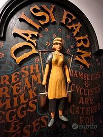 Apparteneva a una rinomata azienda casearia gallese. Sullo sfondo nero si trovano le lettere in rilievo, anch'esse in legno, che formano il nome della fattoria, "Daisy Farm", adattandosi alla curvatura dello stemma di base. Al centro della composizione, una figura femminile, scolpita. Il resto della decorazione è pittorica, con l'indicazione dei prodotti offerti e ornata da piccoli motivi floreali che coprono lo sfondo nero. Segue la tipologia tipica dei manifesti pubblicitari del Regno Unito della metà del XX secolo. Ottimo oggetto decorativo e da collezione. È un pezzo molto particolare da utilizzare per le decorazioni, sia a casa che in un negozio, ristorante o bar.