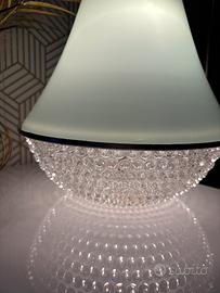 Raffinata lampada da tavolo interamente realizzata in vetro. La parte superiore è composta da una campana conica in vetro opalino color turchese, dalle linee morbide ed eleganti, mentre la base presenta una lavorazione a bolle in rilievo dal suggestivo effetto cristallo, che diffonde la luce con riflessi unici.
