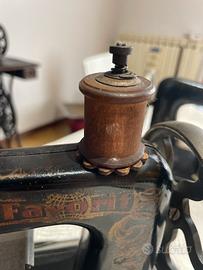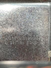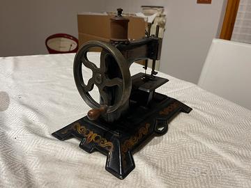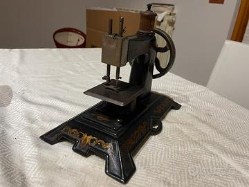 splendida e rara macchina da cucire giocattolo d'epoca modello "Favorit", prodotta dalla celebre fabbrica tedesca Friedrich Wilhelm Müller (F.W.M.) di Berlino. Il pezzo è di altissimo interesse storico: riporta l'incisione originale "Made in Germany - British Zone", che ne colloca la produzione nell'immediato dopoguerra (1945-1949), durante l'occupazione alleata. Caratteristiche e Condizioni: • Meccanica: Perfettamente funzionante e fluida nel movimento. • Completezza: Rarissima configurazione completa di ago, rocchetto in legno originale e sportellino porta-oggetti integro. • Estetica: Decalcomanie originali dell'epoca ben conservate, con logo "Favorit" e motivi floreali tipici. • Struttura: Base in metallo sagomata con incisioni di fabbrica (Aquila e Chiave F.W.M.) nitide e leggibili. Un pezzo da esposizione ideale per collezionisti di giocattoli antichi, macchine da cucire d'epoca o memorabilia della storia post-bellica tedesca.