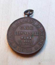 Rara medaglia in bronzo commemorativa dei Giochi Olimpici Intercalati di Atene del 1906, nello specifico relativa alle gare eliminatorie tenutesi a Roma. •Evento:Giochi Olimpici di Atene 1906 (Giochi Intercalati). •Contenuto:Gare eliminatorie a Roma dal 30 marzo al 2 aprile. •Autore:Incisore Giovanni Giani. •Materiale:Bronzo (AE).