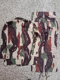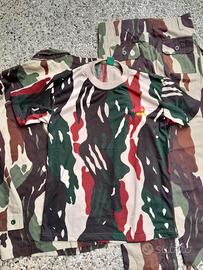 Rara mimetica usata dalle forze speciali indonesiane Kopassandha (poi Kopassus) nota come "flowing blood". Mimetismo unico, tale variante è tra le prime e più difficili da trovare, prodotta tra il 1975 e il 1983. E' in perfette condizioni pari al nuovo e si accompagna con una t-shirt anni '90. L'annuncio non consente di caricare altre foto, pertanto si consiglia di scrivere in privato per avere ulteriori foto con altri dettagli o d'epoca dove si vede tale modello in uso.