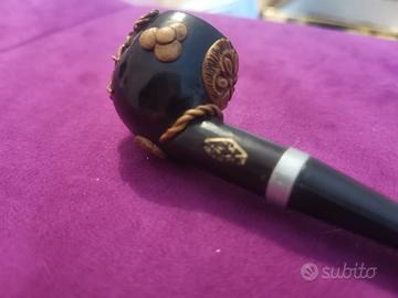 Vendo splendida pipa vintage con marchio originale SH (Schoenewald & Heymann) - Made in Italy. Un pezzo di design unico che fonde l'eleganza della manifattura italiana con uno stile etnico/andino raffinato. Dettagli: Corpo scuro decorato con intarsi metallici geometrici e finissima lavorazione in filigrana lungo il cannello. Qualità:marchio SH dorato ben visibile sul corpo. Condizioni: Ottimo stato conservativo, pezzo raro da trovare con marchio di fabbrica originale. Per collezionisti: Ideale per chi cerca oggetti firmati della tradizione fumistica italiana o complementi d'arredo di alto livello.