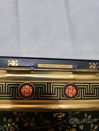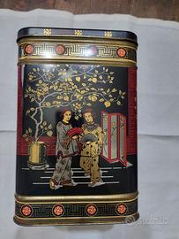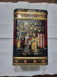 Vendesi splendida scatola di latta vintage litografata, risalente circa agli anni '50/'60, prodotta in Inghilterra (con scritta "Container Made in England"). L'oggetto è un magnifico esempio di stile Chinoiserie (orientale), con decorazioni dettagliate e vivaci su fondo nero lucido, dettagli in oro e rosso vibrante. Dettagli iconografici: Sul coperchio: Raffinate gru in volo e a riposo (simbolo di longevità). Sui lati: Scene di vita tradizionale con figure orientali, alberi fioriti, vasi e paraventi. Bordi decorati con motivi geometrici a greca. Misure: Altezza: 22 cm Base: 15 cm x 14,5 cm Condizioni: L'oggetto è in ottime condizioni vintage, come visibile dalle foto. I colori sono vividi, la struttura è solida e presenta solo una leggera patina naturale che ne attesta l'autenticità e il fascino. Non ci sono ammaccature significative. Perfetta per collezionisti o come ricercato elemento d'arredo per case in stile vintage o etnico.