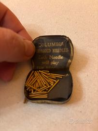 Vendo rara scatolina metallica originale di puntine per grammofono d'epoca, marca Columbia, modello "Duragold". Si tratta di un pezzo di storia della musica risalente agli anni 1920-1930. Queste puntine erano celebri all'epoca perché, a differenza delle comuni puntine in acciaio, erano progettate per durare fino a 10 ascolti (come riportato sulla grafica interna: "Each Needle will play TEN RECORDS").