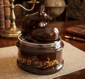 Rara Tabacchiera Royal Doulton "Kingsware" (1901-1921) Splendido umidificatore originale della manifattura inglese Royal Doulton, serie Kingsware. Modello da collezione molto ricercato. • Soggetto: Coperchio scultoreo con volpi dormienti ("Sleeping Foxes") e fregio a rilievo con cani da caccia sul corpo. • Dettagli in Argento: Ghiera superiore in argento 800 punzonato (marchio ben visibile). • Epoca: 1901-1921 circa (datazione confermata dal marchio sul fondo). • Dimensioni: Altezza 19 cm, base 17x13 cm. Oggetto massiccio di grande impatto. Condizioni: Ottime condizioni d'epoca. Segnalo solo una piccola sbeccatura dello smalto sull'orecchio di una volpe (vedi foto macro). Nessuna crepa, filatura o restauro. Disponibile per spedizione accurata o ritiro a mano.