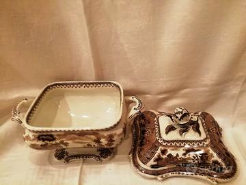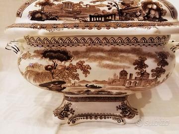 Bellissima e antica zuppiera Egoiste in stoneware, da collezione finemente decorata e con pomolo floreale sul coperchio, che oltre a essere decorato presenta anche dei motivi floreali a rilievo. Anche il piede di appoggio ha decorazioni floreali e geometriche. Il motivo transferware è quello di un'urna classica prominente incastonata in un paesaggio romantico e immaginario. Potrebbe essere stato ispirato da Antonio Canova (1757-1822), scultore di stile neoclassico. Visse e lavorò in Inghilterra per molti anni e fu un espositore regolare alla Royal Academy. Dopo la sua morte la contessa Albrizzi pubblicò nel 1824 The Works of Canova nel 1824, un catalogo delle sculture che aveva creato per clienti inglesi.