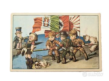 Scopri questo esclusivo set di 6 cartoline originali del 1941, firmate dal celebre illustratore A. Bertiglia, noto per le sue opere satiriche e umoristiche a tema politico e militare durante la Seconda Guerra Mondiale. Le cartoline raffigurano bambini vestiti da soldati delle principali nazioni coinvolte nel conflitto, con dettagli storici e simboli politici dell’epoca, come svastiche, bandiere e uniformi.