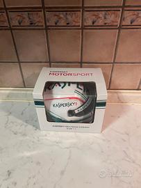 Questo modellino fa parte della prestigiosa Mini Helmet Collection in scala 1:2, prodotta per celebrare il legame tra Kaspersky Lab e il mondo della Formula 1. Il design è caratterizzato dalla calotta bianca con grafiche geometriche nei toni del verde petrolio e del grigio, i colori iconici del brand tech, completati dalla striscia rossa che richiama il DNA racing.