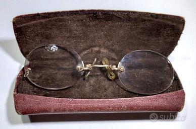 Questo splendido e antico paio di occhiali laminati oro ( come da punzonatura ) ,con custodia originale è stato realizzato da " L. Vabain Opticien " a Clermont Ferrand tra il 1880 e il 1900 . La sua patina e i segni di usura conferiscono agli occhiali un fascino e un carattere vintage davvero speciali , caratteristiche che ne testimoniano la sua lunga vite e l'originalità . Questi occhiali/prince-nez sono l'oggetto decorativo perfetto per la tua vetrina , molto interessanti anche per gli amanti dei bei vecchi tempi del XIX secolo , oppure per gli appassionati dello steampunk o per i nostalgici . Dimensioni L. cm. 10 , diametro lenti vetro cm. 3.9 . Completi di confezione originale dell'epoca , unico piccolo difetto una scheggiatura delle lente ( considerata nel prezzo ) e ben evidenziata nella fotografia . Le fotografie sono originali e parte integrante dell' articolo in vendita .
