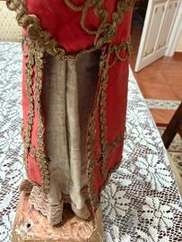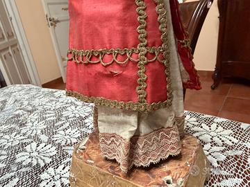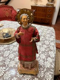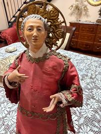 San Cosma insieme a San Damiano (III secolo - 303 d.C. circa) sono stati due fratelli medici romani, martirizzati sotto Diocleziano. Noto come "santi medici" o anargiri(senza argento) perché curavano gratuitamente, sono venerati da tutte le Chiese cristiane. Questa statuetta antica, alta 42 cm con il basamento, che ritrae San Cosma risale al secolo scorso e le vesti sono in tessuto ricamato. La statua, considerata l’età, è in ottime condizioni ed è conservata nella sua campana di vetro. Questo è un oggetto ormai introvabile e sicuramente una rarità per i collezionisti. Per qualsiasi informazione non esitare a contattarmi.