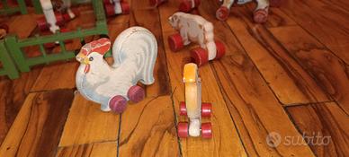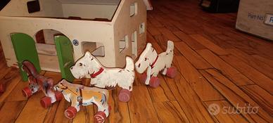 Vero pezzo di storia del giocattolo. Propongo splendida fattoria originale Brio (Svezia) dei primi anni '40. Si tratta di un pezzo di famiglia unico proprietario, appartenuto a mia madre (nata nel 1938) che ci giocava da bambina durante il periodo bellico. L'oggetto è un esempio eccezionale di produzione scandinava pre-1950, caratterizzato dal celebre logo del cavallino alato (Pegaso) rosso, marchio storico della Brio di quegli anni. Il set è straordinariamente completo e comprende: Struttura Fattoria: interamente in legno con tetto rosso, divisori interni e porte originali con chiusura a gancio in metallo. 15 Animali su ruote: pecore, mucche, cavalli, maiali e volatili. Incluso un trio di rari cani Terrier con collare rosso. Tutti i pezzi presentano le litografie originali dell'epoca e le ruote in legno rosso. Accessori: Carretto agricolo, rara casetta per uccelli su palo e recinzione verde componibile. Condizioni: Ottimo stato di conservazione per un oggetto che ha oltre 80 anni. I segni del tempo (patina del legno e lievi mancanze di colore) ne accrescono il valore storico e l'autenticità. Non sono presenti restauri moderni: il pezzo è totalmente originale. Da notare il chiavistello del portone rigido ma funzionante. Ritiro a mano a Milano, zona Piazza Firenze/corso Sempione o zona Lorenteggio (per altre zone possiamo organizzarci).