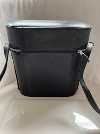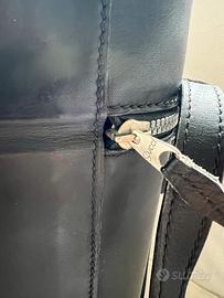 Rarissimo oggetto a firma Gucci: borsa di pelle con chiusura a cerniera con alloggiamenti per termos, box pasto, tovaglietta e posate.