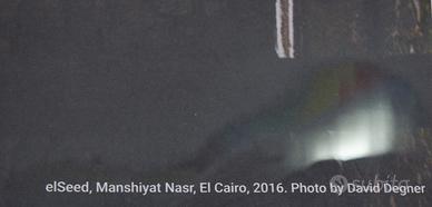 Il poster documenta l’intervento realizzato al Cairo nel 2011, nel cuore di una fase storica cruciale per il mondo arabo. In questo contesto, eL Seed ha saputo trasformare la scrittura in strumento di coesione e bellezza, creando murales monumentali che parlano di identità, rivoluzione e spiritualità.