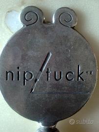 Rarissimo oggetto da collezione:specchio promozionale della serie Nip/Tuck,originale ed ufficiale,tiratura limitata,in ferro di alta qualità,nuovo,mai usato,conservato nel suo sacchetto originale.L'impugnatura raffigura una donna nuda con i segni per le incisioni chirurgiche,sul retro dello specchio c'è il logo ufficiale:la scritta Nip/Tuck separata dal bisturi,e il segno dell'incisione che sottolinea la parola Tuck.Sempre sul retro è presente un leggero graffio in basso a sinistra,presente già quando mi è stato consegnato,sotto il segno lasciato dal bisturi,come mostrato in foto.Lo specchio è alto circa 15 cm,per l'esattezza l'impugnatura è alta circa 8 cm,mentre lo specchio misura circa 6 cm di diametro.Lo specchio è racchiuso in un apposito sacchetto di velluto nero,con il logo bianco ufficiale della serie.Questo specchio è una rarità che solo pochissimi fortunati possono vantarsi di possedere,non era in vendita ma veniva consegnato durante le anteprime della serie,o veniva assegnato in seguito ad estrazioni a premi.Introvabile ovunque!