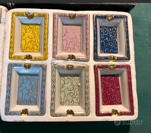 ARTICOLO RARO: RICERCATO set di nr6 posacenere/piattini mignon, della pregiata collezione "VENEZIA GOLD COLLECTION" realizzati in porcellana di LIMOGES dipinta a mano con dettagli in oro zecchino. Vintage riconducibili anni '80. CONDIZIONI: nuovi ancora imballati, DA COLLEZIONE o IdeaRegalo da vagliare anche come eventuale BOMBONIERA.