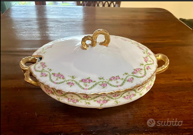 RARITA': ELEGANTE e ESCLUSIVO servizio completo/set da portata realizzato in pregiata porcellana LIMOGES France, tinta bianco lucido decorata con ghirlande di rose rosa e preziosi bordi smerlati dorati in oro zecchino, dettagli in rilievo. Antico riconducibile primi '900, proveniente da collezione privata Villa Veneta. CONDIZIONI: ottimo stato conservativo ma essendo un articolo antico/vintage può presentare i lievi segni del tempo che ne attestano l'originalità e il fascino. Sono in totale 100pz., ed esattamente: