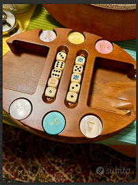 PREZIOSO ed ESCLUSIVO set da GIOCO realizzato in pregiato legno di noce, kit per gioco del poker. Il set è contenuto in una scatola ovale con coperchio che presenta un intarsio/decorazione che raffigura i semi delle carte da poker al suo interno abbiamo i dadi e le fiches colorate con i valori in euro.CONDIZIONI: buono stato conservativo ma essendo un articolo antico/vintage può presentare i lievi segni (vedi foto finali) del tempo che ne attestano l'originalità e il fascino. Da COLLEZIONE o Idea Regalo