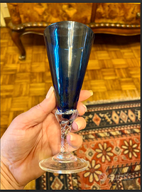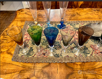 Questi bicchieri da champagne in vetro colorato, rappresentano la tradizione vetraria italiana del XX Secolo, particolarmente associata alle fornaci di Murano. Prodotti tra gli anni '70/'80, questi pezzi riflettono l'estetica Century Modern con l'uso audace di colori vivaci come il blu, verde, ambra e rosso. La tecnica del vetro soffiato a mano permetteva di creare pezzi unici con variazioni sottili di tonalità e forma. Particolarmente apprezzati dai collezionisti di vetro vintage.