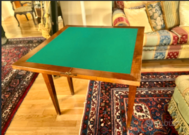 ESCLUSIVO e PREGIATO tavolo da gioco pieghevole in mogano con superficie in feltro verde, stile EDOARDIANO. Antico, riconducibile XX Secolo circa 1901/1910. Realizzato in mogano di alta qualità, presente la caratteristica superficie pieghevole rivestita in feltro verde, tipica dei tavoli da carte dell'epoca. CONDIZIONI: buono stato conservativo ma essendo un articolo antico/vintage può presentare i lievi segni del tempo che ne attestano l'originalità e il fascino (SEGNALO inizio screpolatura su base legno quando chiuso, VEDI ultima FOTO). Pezzo da COLLEZIONE o Idea Regalo