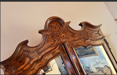 ESCLUSIVA e RARISSIMA VETRINA/TRUMEAU, un mobile antico a doppio corpo, VENEZIANO realizzato in legno di noce e radica con intarsi e specchi incisi. E' composto da un cassettone inferiore con cassetti sagomati e da un'alzata superiore con ante e specchio. La parte centrale presenta una ribalta che si apre per fungere da scrittoio. Antica risalente Fine 800 in stile Luigi XV.