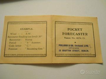 L'oggetto è un Pocket Weather Forecaster (Previsore Meteo Tascabile) prodotto dalla storica ditta londinese Negretti & Zambra e brevettato nel 1915 (Brevetto n. 6276/15). Questo esemplare è stato venduto da Pollock & Co. (Ireland) Ltd., strumenti ottici di Dublino, come indicato dalla etichetta che è stata sovrapposta sulla scatola originale che riportava la scritta Negretti & Zambra che si può dedurre notando N....................A prima e dopo l'etichetta.