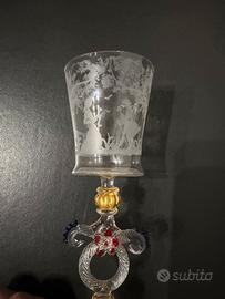 Magnifico e unico calice in vetro soffiato, un pezzo d'arte decorativa che richiama gli antichi fasti del vetro europeo. È un oggetto ideale per vetrinette da collezione o come elemento decorativo di grande impatto.