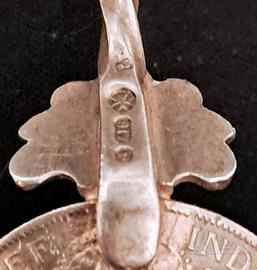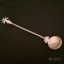 Raro ed insolito cucchiaio da tè , la ciotola è ricavata da una moneta realizzato con una moneta da uno scellino di Giorgio V del 1916. Il pomello di questo raffinato cucchiaio presenta la Croce di Malta a otto punte di Malta o Amalfi per i Cavalieri di Malta e l'Ordine di San Giovanni. Il cucchiaio presenta un gambo con un design a torsione lunghezza (17 cm) e pesa oltre 31,2 grammi. Vedi foto dettagliate del cucchiaio e della raffinata moneta e della punzonatura . Oggetto come da foto