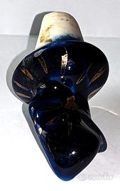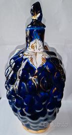 Raro decanter per vino ucraino, in forma di grappolo d’uva, colorato in blu cobalto con pampini bianco e oro.