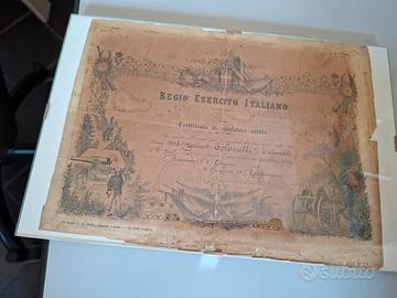 RARO DIPLOMA 1903 Regio Esercito - "Puntatore Scelto" 10° Artiglieria - INCORNICIATO ________________________________________ Proponiamo un autentico frammento di storia militare italiana dell'epoca umbertina: un Certificato di Puntatore Scelto rilasciato il 3 giugno 1903 a Brescia. Il documento è intestato al Caporale Edoardo Colonetti, in forza al prestigioso 10° Reggimento Artiglieria da Campagna. Perché sceglierlo: •Estetica Straordinaria: Riccamente decorato con fregi d'epoca, lo stemma di Casa Savoia e scene dettagliate di artiglieria ippotrainata e costiera. Una vera opera d'arte litografica. •Stato di Conservazione: Il documento presenta l'affascinante patina del tempo (ingiallimento e piccoli segni ai bordi) che ne garantisce l'assoluta autenticità e il fascino dei suoi 122 anni. (Vedasi fotografie che certificano lo stato di fatto) •Già Incorniciato: Viene proposto completo di cornice per proteggerne l'integrità e renderlo immediatamente pronto per l'esposizione in studi professionali, librerie o collezioni private. •Rarità: Un pezzo difficile da reperire relativo alle specializzazioni tecniche del Regio Esercito pre-Grande Guerra. ________________________________________ DETTAGLI TECNICI: •Anno: 1903 (Originale dell'epoca). •Dimensioni: Circa 37x28 cm (più cornice). •Località: Rilasciato a Brescia.
