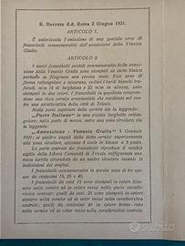 In questa occasione 1921 le Poste Regie emisero tre francobolli per celebrare l'annessione dei territori per cui si combatterono battaglie durissime e morirono oltre