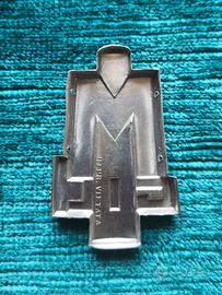 Fregio d’epoca della Gioventù Italiana del Littorio (G.I.L.), anni '30/'40. Originale al 100%. Rarità: Presenta sul retro la marcatura ufficiale "RIPR. VIETATA". Dettagli: Dimensioni 5 x 3 cm. In lamierino stampato con fori laterali d'epoca per applicazione su gagliardetti o oggettistica. Stato: Ottime condizioni, fregio nitido e ben conservato. Pezzo immancabile per collezionisti di militaria e oggettistica del Ventennio.