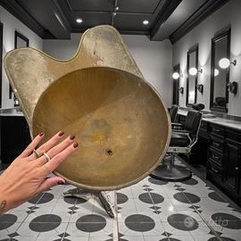 C’era un tempo in cui i saloni da barbiere erano piccoli mondi d’altri tempi: profumo di lozione dopobarba, rasoi che brillavano sotto la luce del giorno e il lento scorrere dell’acqua calda dentro una bacinella come questa. Questo lavatesta degli anni Venti–Trenta è uscito da uno di quei luoghi. La vaschetta in ottone — leggermente ossidata dal tempo — racconta il passaggio di mille mani esperte, di clienti seduti con la testa reclinata, mentre l’acqua scivolava via dal piccolo foro al centro, come a portare con sé il peso della giornata. La piantana regolabile in ghisa, pesante e stabile, sostiene ancora oggi tutta la sua eleganza industriale. Al tatto è freddo, materico, autentico. A guardarlo, si immagina il riflesso dei pavimenti in graniglia, le voci maschili che si intrecciano e la lama del rasoio che si affila sul cuoio. È un oggetto che porta con sé la memoria del gesto semplice del prendersi cura. Oggi, in un ambiente moderno o vintage, può diventare una scultura funzionale, un elemento di arredo scenografico e assolutamente immancabile in un barber shop, mantenendo intatta la sua anima d’epoca.