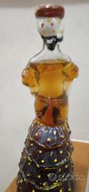 Design Unico:La bottiglia in vetro soffiato presenta una forma figurativa che ritrae un'elegante dama, spesso identificata come una "ballerina spagnola" o "flamenca", completa di abito a balze con dettagli gialli e rossi dipinti a mano.