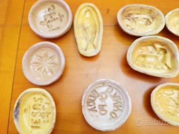 Vendesi eccezionale lotto composto da 12 stampi originali degli anni '50 in ceramica, utilizzati per la creazione dei dolci tipici della tradizione siciliana di Ognissanti e della Commemorazione dei Defunti (Pupi di Zucchero / Statuette di zucchero). Manufatti autentici di metà Novecento, caratterizzati da una definizione dei dettagli superiore ai comuni stampi in gesso. Dettagli: Quantità: 12 pezzi (lotto completo). Epoca: 1950 circa. Materiale: Ceramica d'epoca lavorata a stampo. Soggetti: Figure tradizionali della festività dei "Morti". Stato di conservazione: Ottime condizioni vintage. La ceramica conserva i dettagli originali e la patina del tempo che ne certifica l'autenticità. Spedizione: Si garantisce imballaggio professionale ultra-rinforzato con pluriball e doppia protezione per garantire l'integrità della ceramica. Spedizione tracciata in tutta Italia o ritiro a mano a Messina.