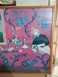 Opera: Poster originale d'epoca (stampa del 1986) della celebre opera di Henri Matisse. Si tratta di un'edizione speciale per la mostra "Impressionist to Early Modern Paintings from the U.S.S.R.". Particolarità Unica: A differenza dell'originale "Armonia in Rosso", questa specifica stampa d'epoca presenta un fondo rosa/magenta. Non è il classico rosso acceso, ma una tonalità rosata più rara e decorativa, che rende l'opera più luminosa e originale. Cornice: Il pezzo è montato su una cornice in legno massello di ottima qualità, realizzata su misura da un artigiano corniciaio. Non è una cornice industriale. Come potete vedere dalle foto la cornice presenta lievissimi segni di usura estetici sui 4 bordi laterali, e qualche graffietto generale. Sul lato posteriore invece presentano strappi e macchie, ma niente che compromette il quadro, e perfettamente intatto e integro. Dettagli Tecnici: Dimensioni: 80 cm x 86 cm (formato grande, di grande impatto visivo). Anno di produzione: 1986. Colori: Fondo Rosa dominante con decorazioni blu e finestra su paesaggio verde/azzurro. Stato: Ottime condizioni vintage. Stile: Perfetto per chi cerca un pezzo di design Post-Moderno o Mid-Century. Si adatta splendidamente a pareti chiare, studi professionali o salotti eleganti. Per ulteriori informazioni o foto contattatemi in privato.