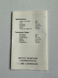 marengo 20 franchi commemorativo luxembourg 150⁰ 1839 al 1989. Jean grand duc de luxembourg.