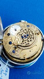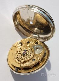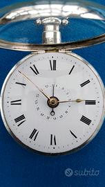Stupendo e raro orologio da tasca con doppia cassa in argento sterling, prodotto nel 1790-1800 circa. Funzionamento meccanico a carica manuale con scappamento a verga, con funzione data (numero del giorno del mese). Quadrante originale in ceramica smaltata intatto, con indici delle ore in numeri romani; lancette originali in ottime condizioni. Il meccanismo, con pilastrini quadrati e splendidamente inciso, brilla come fosse nuovo. Entrambe le casse sono in ottime condizioni, le cerniere sono belle e robuste, tutte le copertine si chiudono in stretta aderenza. Vetro originale bombato a cupola con lente centrale, in ottime condizioni. L’orologio è corredato di un vecchio documento originale di riparazione di un orologiaio inglese. Recentemente revisionato professionalmente e in ottime condizioni di funzionamento. La cassa esterna ha un diametro di 61 mm; l’orologio ha uno spessore di 27 mm e un peso di 136 grammi.